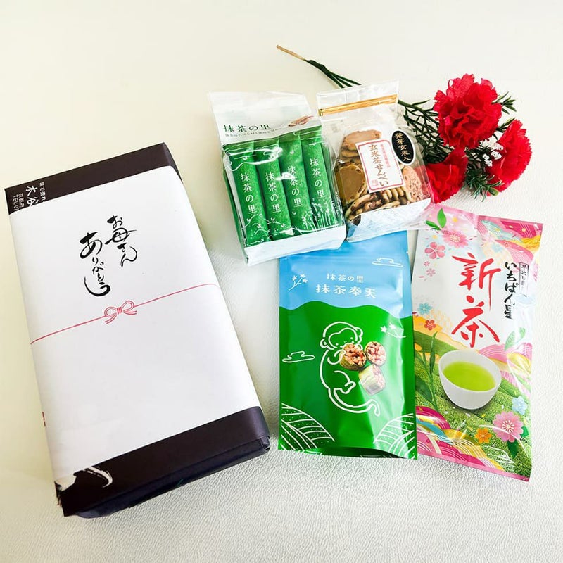 今年の一番摘みの茶葉である「いちばん星」とお菓子3点のセットです。母の日専用の熨斗サービス付きです。