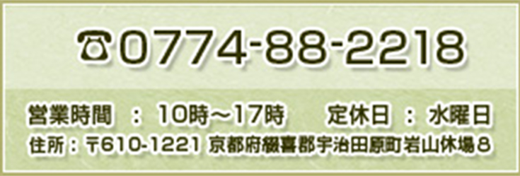 宇治・平等院から車で10分という場所に御座いますので、お近くにお寄りの節は、是非お立ち寄り下さい。