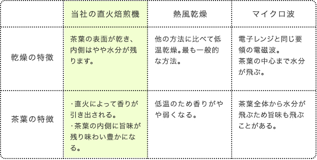 製茶のプロセスで味への影響が最も大きいと言われているのは、火入れ(焙煎)です。 茶葉の仕上げ過程では、最終的には5%以下までに水分含有量を飛ばしますが、その方法によって大きく味の違いが出てきます。 当社では、極小の直火から遠赤外線を発生させてじっくり2段階に分けて火入れを行っています。この火入れ方法は、試行錯誤を重ね独自に作った焙煎機を使っており、他店の味と一線を画した味わいを作り出す当社の最大の特徴です。